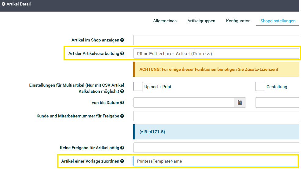 Um ein Printess Template mir einem Artikel zu verknüpfen, stellen Sie "Art der Artikelverarbeitung" auf "PR" und hinterlegen den Printess Template Name unter "Artikel einer Vorlage zuordnen".