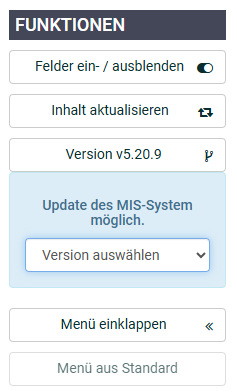 Die Administratoren eines Systems haben die Möglichkeit im linken Hauptmenü im Bereich "Funktionen" eine Kachel mit der aktuellen Version zu sehen und beim Klick auf diese Kachel ein Dropdown zu bekommen, in dem verfügbare Updates für das System aufgelistet sind.